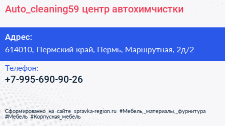 Auto_cleaning59, центр автохимчистки по адресу 614010, Пермский край, Пермь, Маршрутная, 2д/2 в дальнейшем Организация, размещена в следующих категориях: