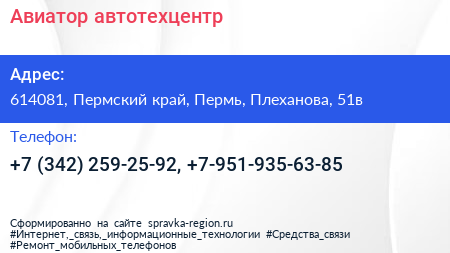 Авиатор, автотехцентр по адресу 614081, Пермский край, Пермь, Плеханова, 51в в дальнейшем Организация, размещена в следующих категориях: