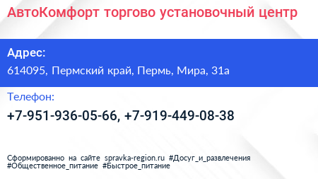 АвтоКомфорт, торгово-установочный центр по адресу 614095, Пермский край, Пермь, Мира, 31а в дальнейшем Организация, размещена в следующих категориях:
