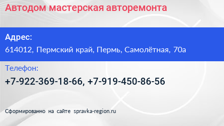Автодом, мастерская авторемонта по адресу 614012, Пермский край, Пермь, Самолётная, 70а в дальнейшем Организация, размещена в следующих категориях: