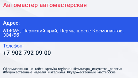 Автомастер, автомастерская по адресу 614065, Пермский край, Пермь, шоссе Космонавтов, 304/5б в дальнейшем Организация, размещена в следующих категориях: