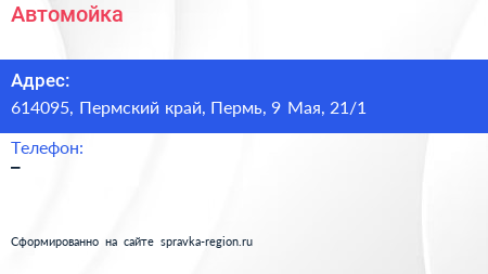 Автомойка по адресу 614095, Пермский край, Пермь, 9 Мая, 21/1 в дальнейшем Организация, размещена в следующих категориях: