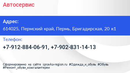 Автосервис по адресу 614025, Пермский край, Пермь, Бригадирская, 20 к1 в дальнейшем Организация, размещена в следующих категориях: