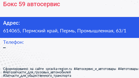 Бокс 59, автосервис по адресу 614065, Пермский край, Пермь, Промышленная, 63/1 в дальнейшем Организация, размещена в следующих категориях: