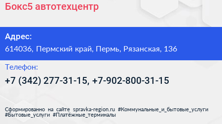 Бокс5, автотехцентр по адресу 614036, Пермский край, Пермь, Рязанская, 136 в дальнейшем Организация, размещена в следующих категориях: