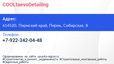 COOLtaevoDetailing по адресу 614520, Пермский край, Пермь, Сибирская, 8 в дальнейшем Организация, размещена в следующих категориях: