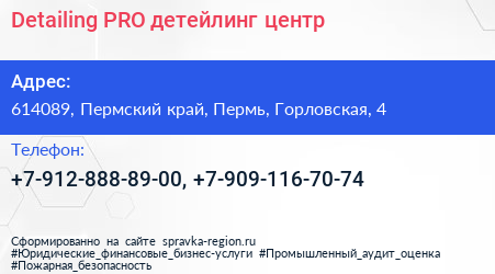 Detailing PRO, детейлинг-центр по адресу 614089, Пермский край, Пермь, Горловская, 4 в дальнейшем Организация, размещена в следующих категориях: