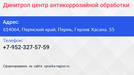 Динитрол, центр антикоррозийной обработки по адресу 614064, Пермский край, Пермь, Героев Хасана, 55 в дальнейшем Организация, размещена в следующих категориях: