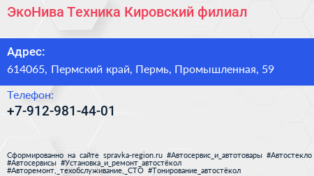 ЭкоНива-Техника, Кировский филиал по адресу 614065, Пермский край, Пермь, Промышленная, 59 в дальнейшем Организация, размещена в следующих категориях: