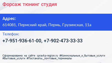 Форсаж, тюнинг-студия по адресу 614081, Пермский край, Пермь, Грузинская, 11а в дальнейшем Организация, размещена в следующих категориях: