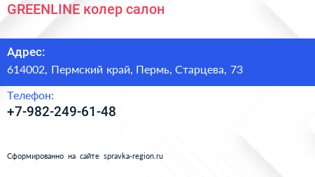 GREENLINE, колер-салон по адресу 614002, Пермский край, Пермь, Старцева, 73 в дальнейшем Организация, размещена в следующих категориях: