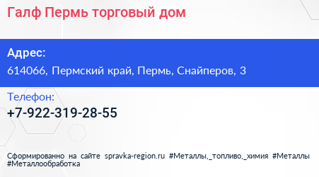 Галф-Пермь, торговый дом по адресу 614066, Пермский край, Пермь, Снайперов, 3 в дальнейшем Организация, размещена в следующих категориях: