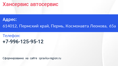 Хансервис, автосервис по адресу 614012, Пермский край, Пермь, Космонавта Леонова, 65а в дальнейшем Организация, размещена в следующих категориях: