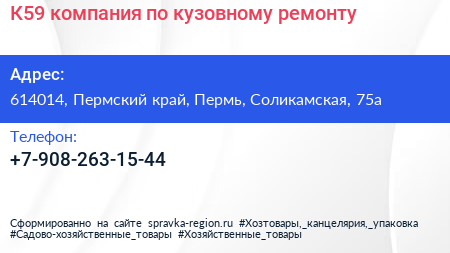 К59, компания по кузовному ремонту по адресу 614014, Пермский край, Пермь, Соликамская, 75а в дальнейшем Организация, размещена в следующих категориях: