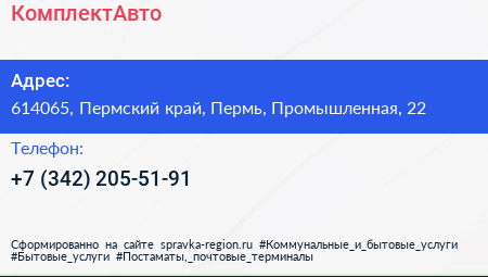 КомплектАвто по адресу 614065, Пермский край, Пермь, Промышленная, 22 в дальнейшем Организация, размещена в следующих категориях: