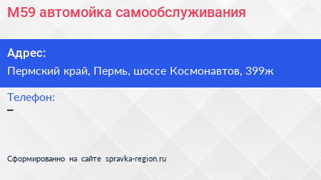 М59, автомойка самообслуживания по адресу Пермский край, Пермь, шоссе Космонавтов, 399ж в дальнейшем Организация, размещена в следующих категориях: