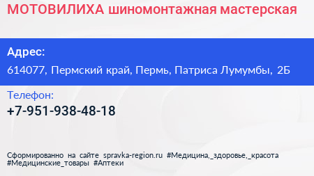 МОТОВИЛИХА, шиномонтажная мастерская по адресу 614077, Пермский край, Пермь, Патриса Лумумбы, 2Б в дальнейшем Организация, размещена в следующих категориях: