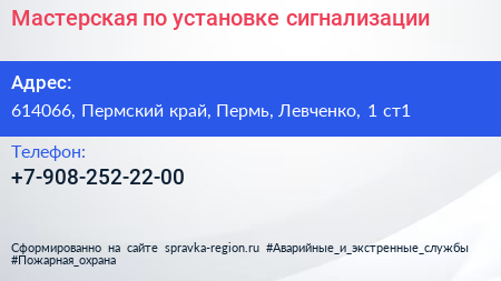 Мастерская по установке сигнализации по адресу 614066, Пермский край, Пермь, Левченко, 1 ст1 в дальнейшем Организация, размещена в следующих категориях: