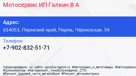 Мотосервис, ИП Галкин В.А. по адресу 614053, Пермский край, Пермь, Чёрмозская, 54 в дальнейшем Организация, размещена в следующих категориях: