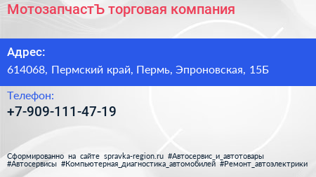 МотозапчастЪ, торговая компания по адресу 614068, Пермский край, Пермь, Эпроновская, 15Б в дальнейшем Организация, размещена в следующих категориях: