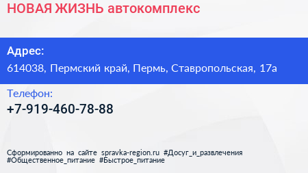 НОВАЯ ЖИЗНЬ, автокомплекс по адресу 614038, Пермский край, Пермь, Ставропольская, 17а в дальнейшем Организация, размещена в следующих категориях: