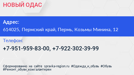 НОВЫЙ ОДАС по адресу 614025, Пермский край, Пермь, Козьмы Минина, 12 в дальнейшем Организация, размещена в следующих категориях: