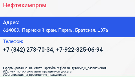 Нефтехимпром по адресу 614089, Пермский край, Пермь, Братская, 137а в дальнейшем Организация, размещена в следующих категориях: