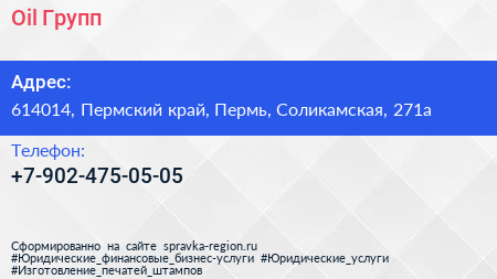 Oil Групп по адресу 614014, Пермский край, Пермь, Соликамская, 271а в дальнейшем Организация, размещена в следующих категориях: