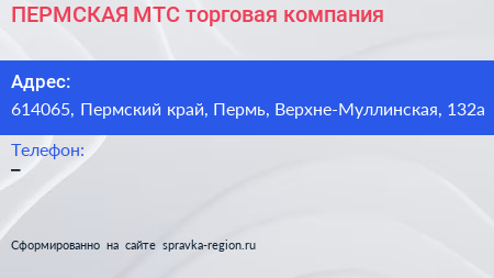 ПЕРМСКАЯ МТС, торговая компания по адресу 614065, Пермский край, Пермь, Верхне-Муллинская, 132а в дальнейшем Организация, размещена в следующих категориях: