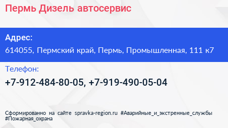 Пермь Дизель, автосервис по адресу 614055, Пермский край, Пермь, Промышленная, 111 к7 в дальнейшем Организация, размещена в следующих категориях: