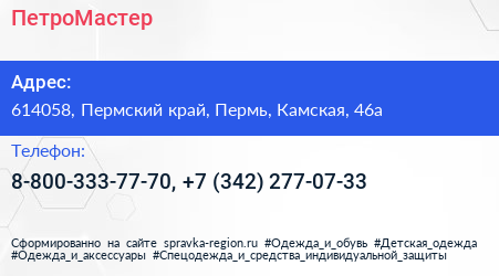 ПетроМастер по адресу 614058, Пермский край, Пермь, Камская, 46а в дальнейшем Организация, размещена в следующих категориях: