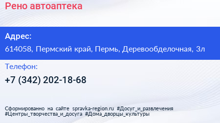 Рено, автоаптека по адресу 614058, Пермский край, Пермь, Деревообделочная, 3л в дальнейшем Организация, размещена в следующих категориях: