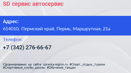 SD-сервис, автосервис по адресу 614010, Пермский край, Пермь, Маршрутная, 21а в дальнейшем Организация, размещена в следующих категориях: