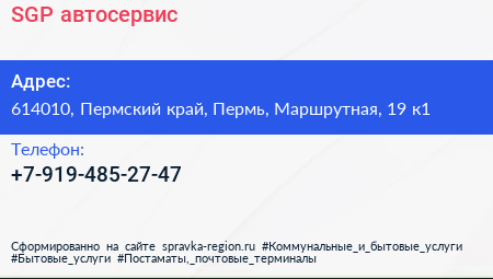 SGP, автосервис по адресу 614010, Пермский край, Пермь, Маршрутная, 19 к1 в дальнейшем Организация, размещена в следующих категориях: