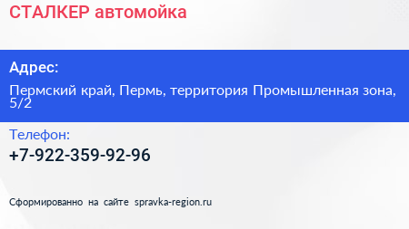 СТАЛКЕР, автомойка по адресу Пермский край, Пермь, территория Промышленная зона, 5/2 в дальнейшем Организация, размещена в следующих категориях: