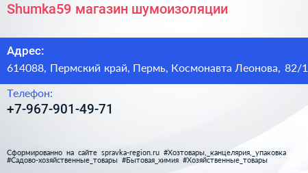 Shumka59, магазин шумоизоляции по адресу 614088, Пермский край, Пермь, Космонавта Леонова, 82/1 в дальнейшем Организация, размещена в следующих категориях: