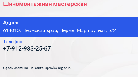 Шиномонтажная мастерская по адресу 614010, Пермский край, Пермь, Маршрутная, 5/2 в дальнейшем Организация, размещена в следующих категориях: