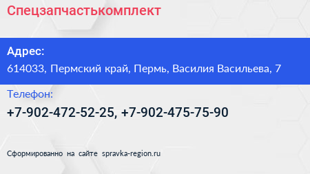 Спецзапчастькомплект по адресу 614033, Пермский край, Пермь, Василия Васильева, 7 в дальнейшем Организация, размещена в следующих категориях: