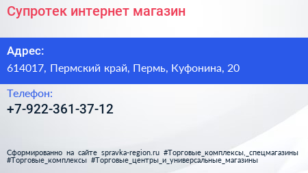 Супротек, интернет-магазин по адресу 614017, Пермский край, Пермь, Куфонина, 20 в дальнейшем Организация, размещена в следующих категориях: