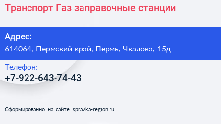 Транспорт-Газ, заправочные станции по адресу 614064, Пермский край, Пермь, Чкалова, 15д в дальнейшем Организация, размещена в следующих категориях: