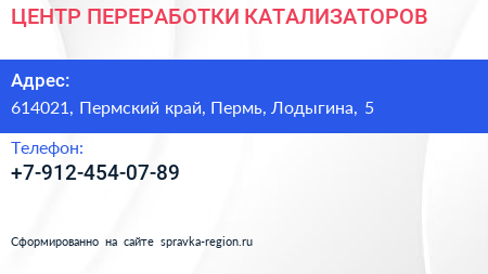 ЦЕНТР ПЕРЕРАБОТКИ КАТАЛИЗАТОРОВ по адресу 614021, Пермский край, Пермь, Лодыгина, 5 в дальнейшем Организация, размещена в следующих категориях: