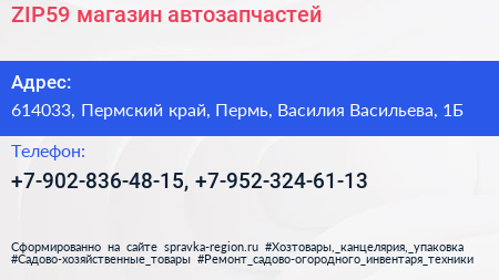 ZIP59, магазин автозапчастей по адресу 614033, Пермский край, Пермь, Василия Васильева, 1Б в дальнейшем Организация, размещена в следующих категориях: