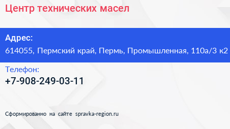 Центр технических масел по адресу 614055, Пермский край, Пермь, Промышленная, 110а/3 к2 в дальнейшем Организация, размещена в следующих категориях: