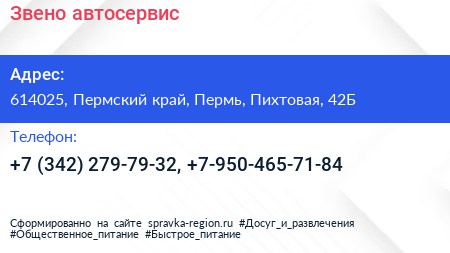 Звено, автосервис по адресу 614025, Пермский край, Пермь, Пихтовая, 42Б в дальнейшем Организация, размещена в следующих категориях: