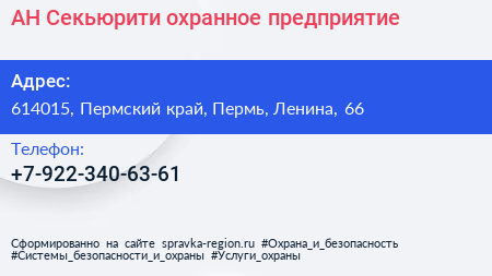 АН-Секьюрити, охранное предприятие по адресу 614015, Пермский край, Пермь, Ленина, 66 в дальнейшем Организация, размещена в следующих категориях:
