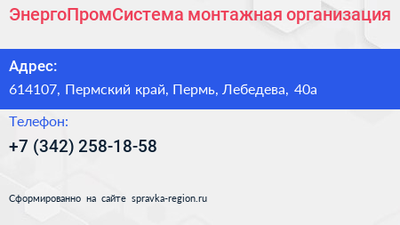 ЭнергоПромСистема, монтажная организация по адресу 614107, Пермский край, Пермь, Лебедева, 40а в дальнейшем Организация, размещена в следующих категориях: