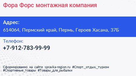 Фора-Форс, монтажная компания по адресу 614064, Пермский край, Пермь, Героев Хасана, 37Б в дальнейшем Организация, размещена в следующих категориях: