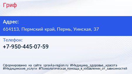 Гриф по адресу 614113, Пермский край, Пермь, Уинская, 37 в дальнейшем Организация, размещена в следующих категориях: