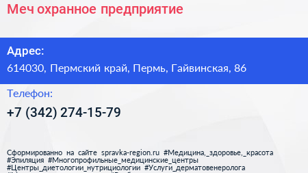 Меч, охранное предприятие по адресу 614030, Пермский край, Пермь, Гайвинская, 86 в дальнейшем Организация, размещена в следующих категориях: