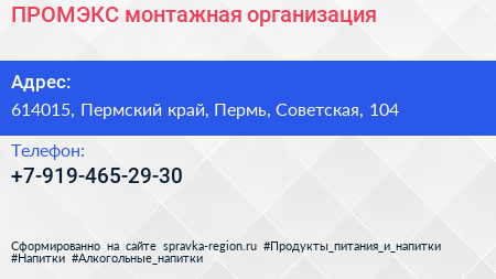 ПРОМЭКС, монтажная организация по адресу 614015, Пермский край, Пермь, Советская, 104 в дальнейшем Организация, размещена в следующих категориях: